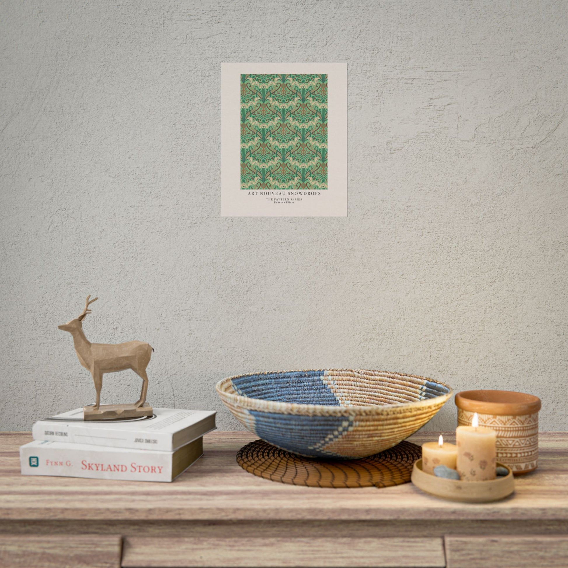This art print brings Rebecca Elfast’s original artwork into your space, in the form of a beautiful pattern. This print features an Art Nouveau inspired pattern with stylized snowdrops. Perfect for the garden lover. Unframed and ready to unroll, the print slips into a wide range of interiors: a calm corner for evening reading, a sunlit bathroom shelf, or a gallery wall mixed with travel finds.