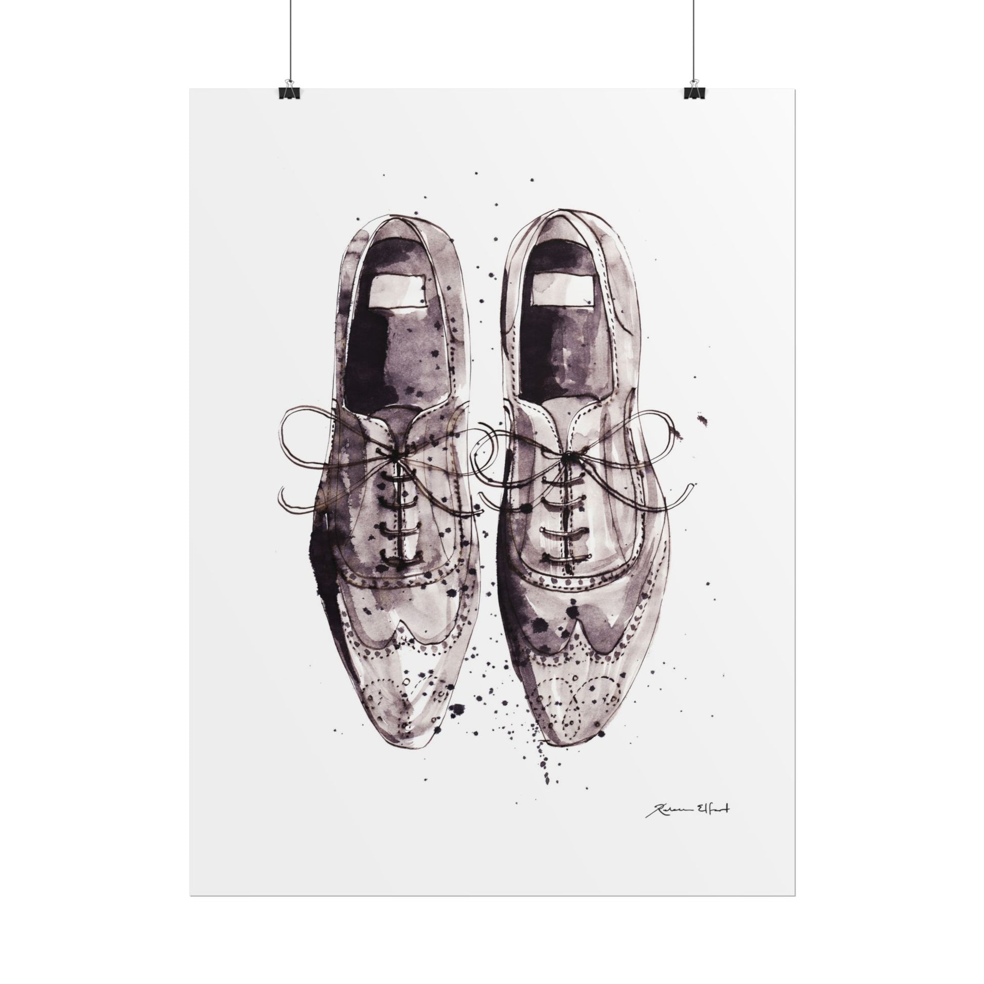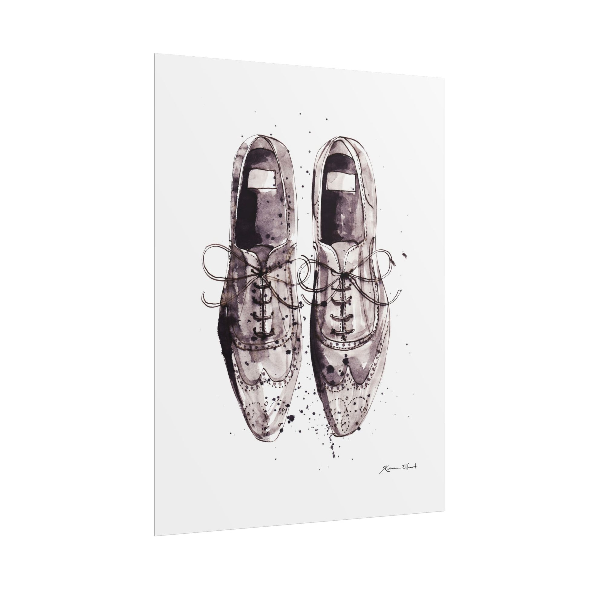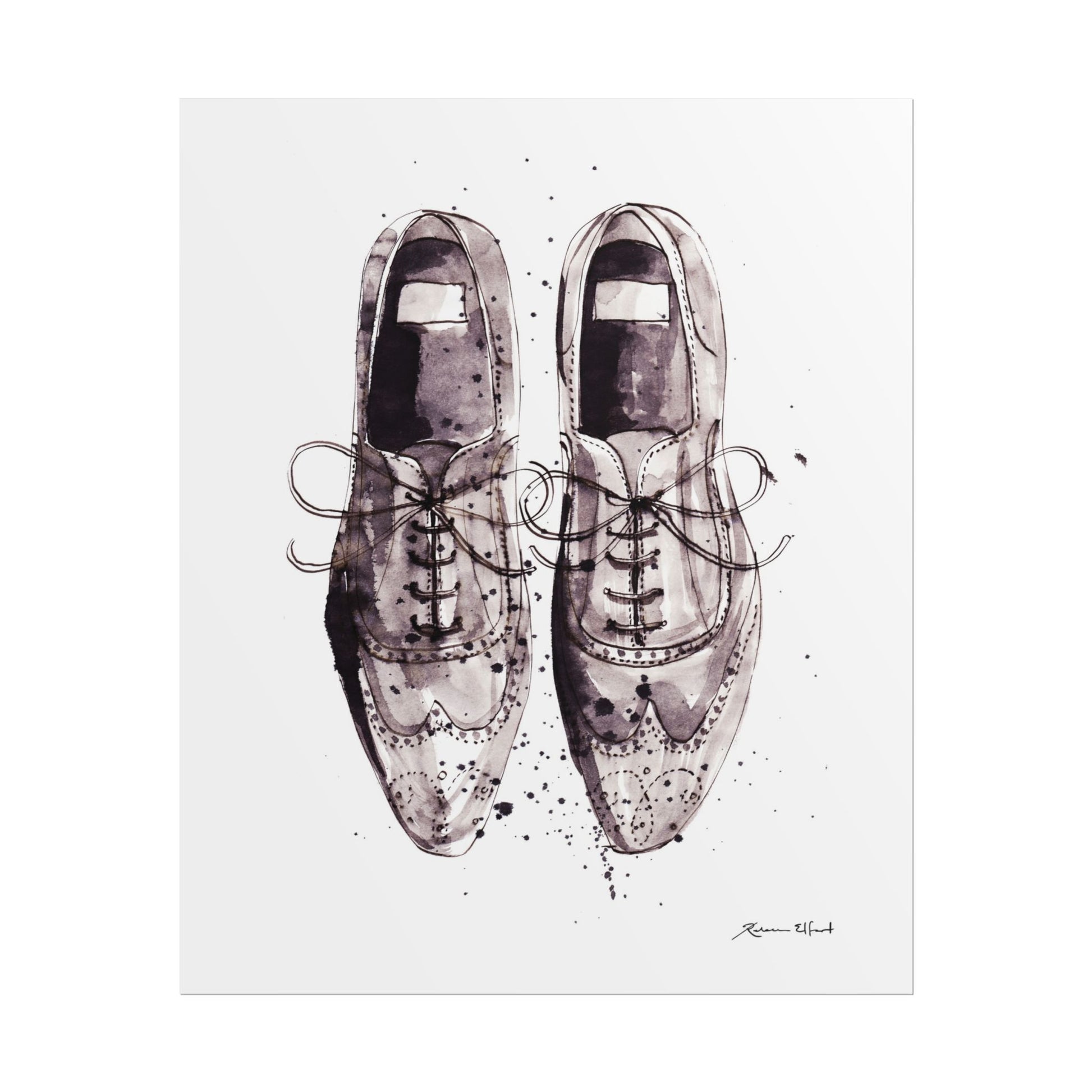 Elegant and artistic poster featuring a loose ink drawing of fashionable brogue shoes in black-and-white. Perfect for the fashionista or gentleman looking to add a touch of style to their space. Ideal for home decor, fashion enthusiasts, and art lovers. Great for occasions like birthdays, housewarmings, and holidays.