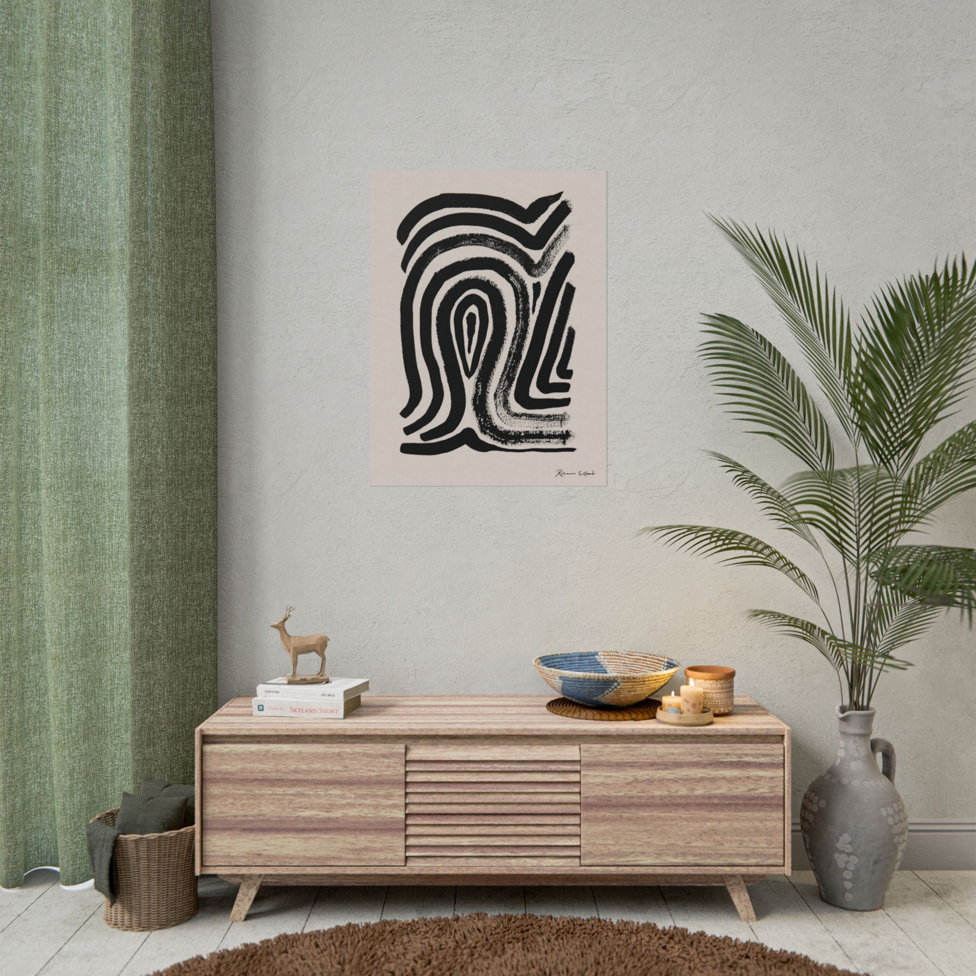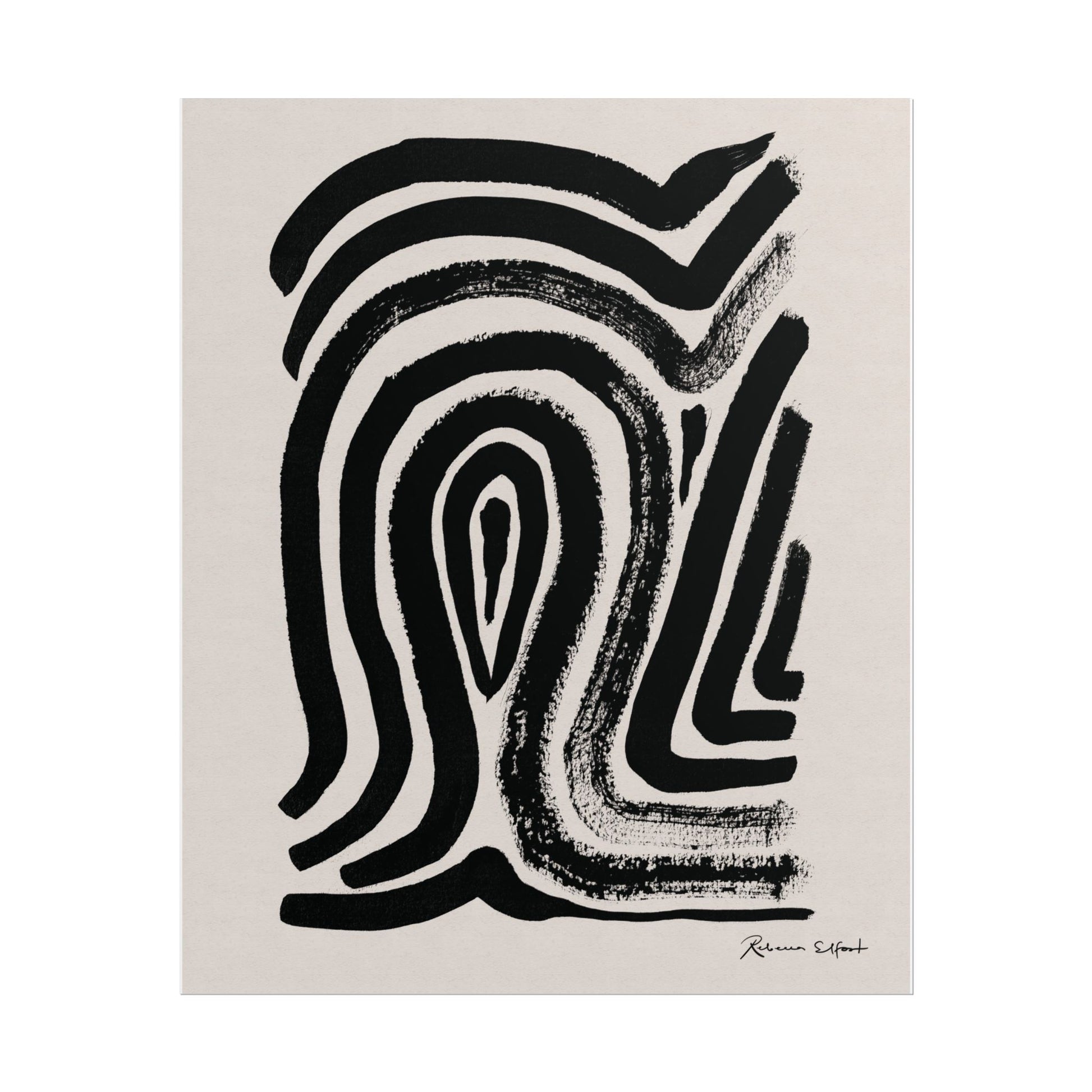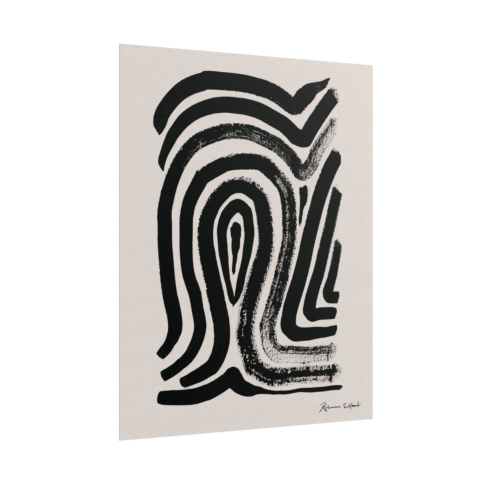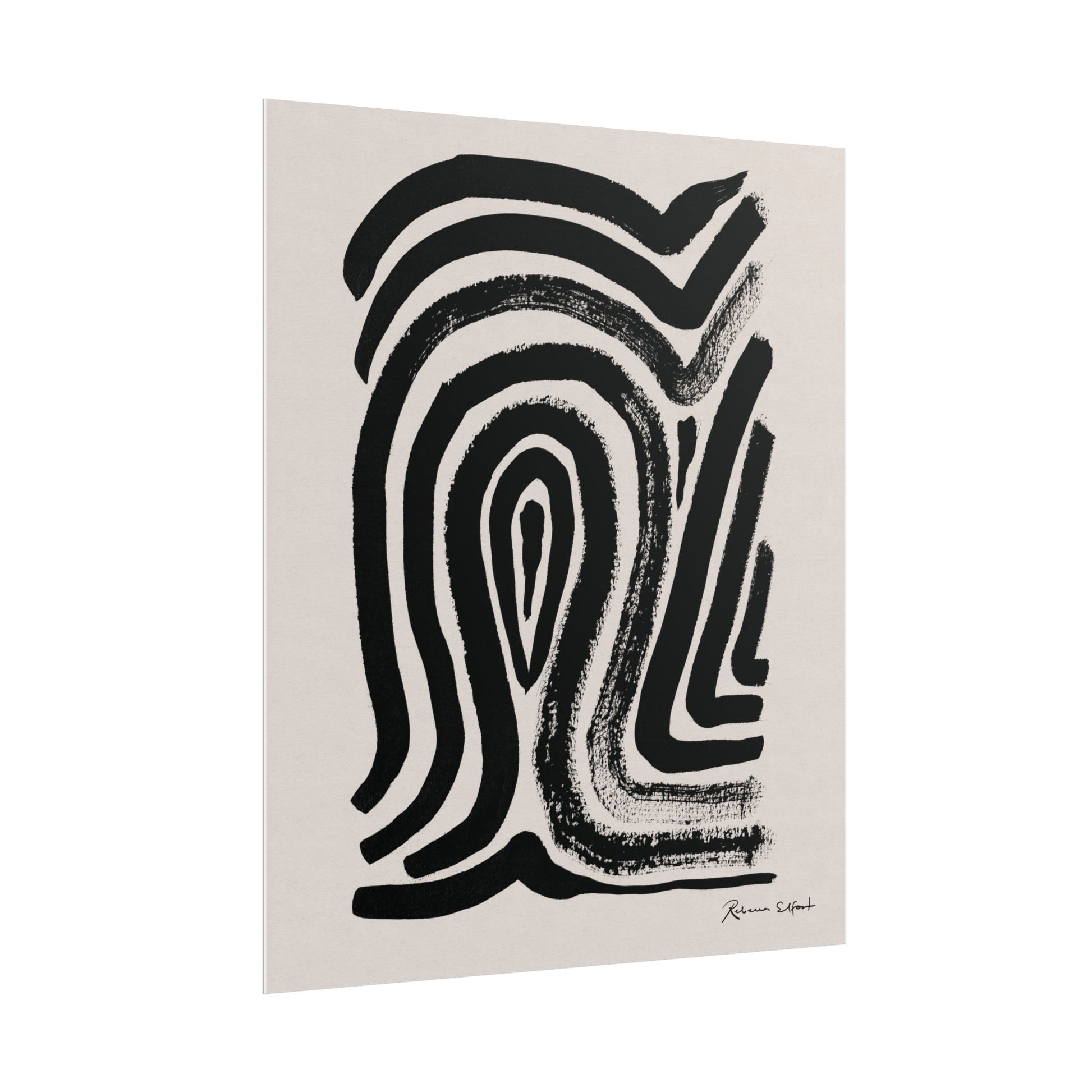 This art print brings Rebecca Elfast’s original ink painting into your space with bold graphic vibes. An abstract motif that reminds of a fingerprint, rendered in confident black strokes adds an eyecatching focus point to your space. Unframed and ready to unroll, the print slips into a wide range of interiors: a calm corner for evening reading, a sunlit bathroom shelf, or a gallery wall mixed with travel finds.