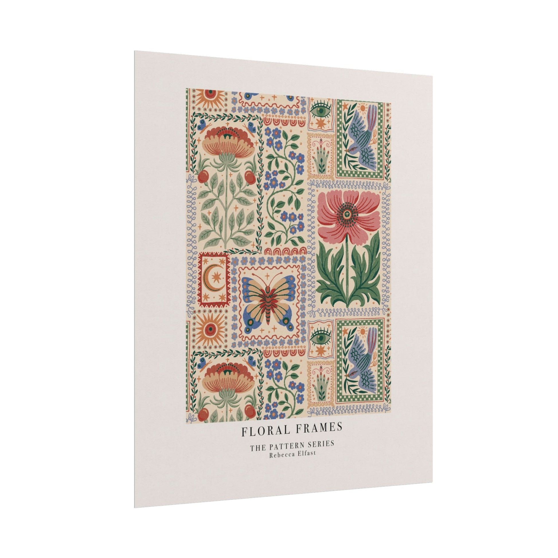 This art print brings Rebecca Elfast’s original artwork into your space, in the form of a beautiful pattern. This print features a bohemian, flowy pattern with colorful flowers, butterflies and birds in a grid structure of ornate frames. Perfect for the garden lover. Unframed and ready to unroll, the print slips into a wide range of interiors: a calm corner for evening reading, a sunlit bathroom shelf, or a gallery wall mixed with travel finds.