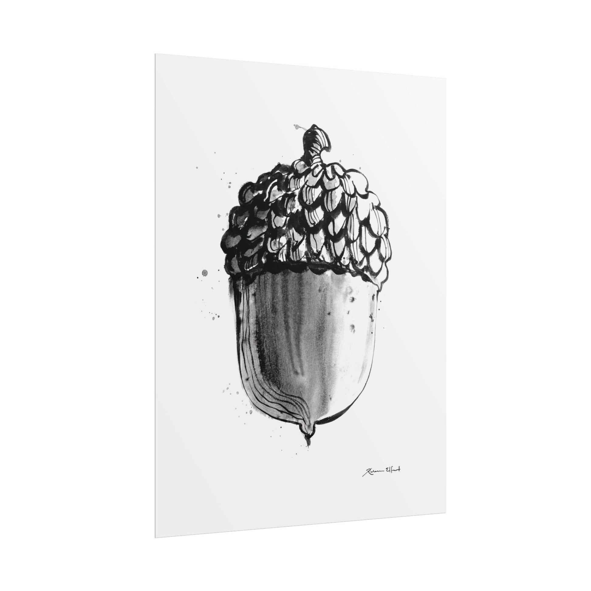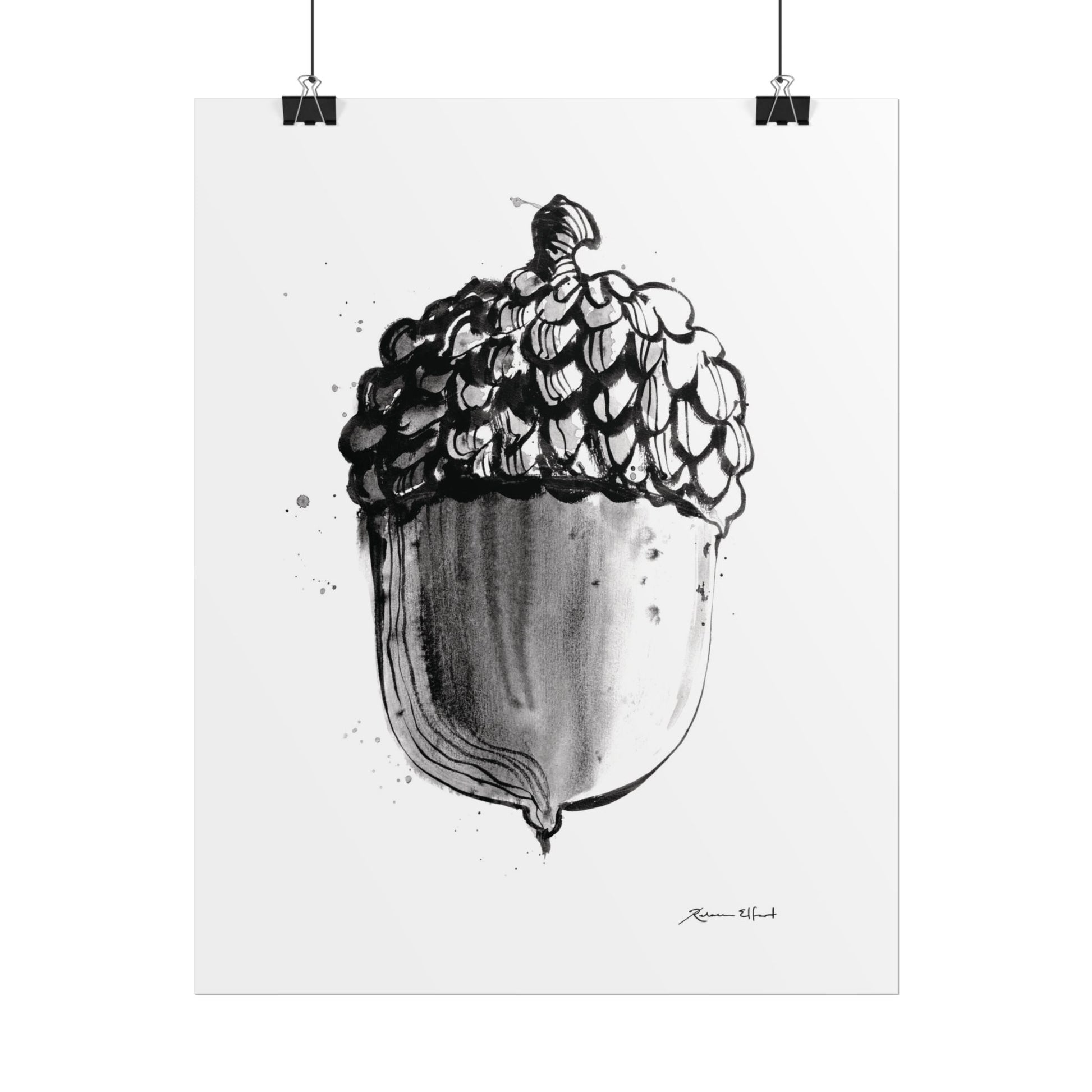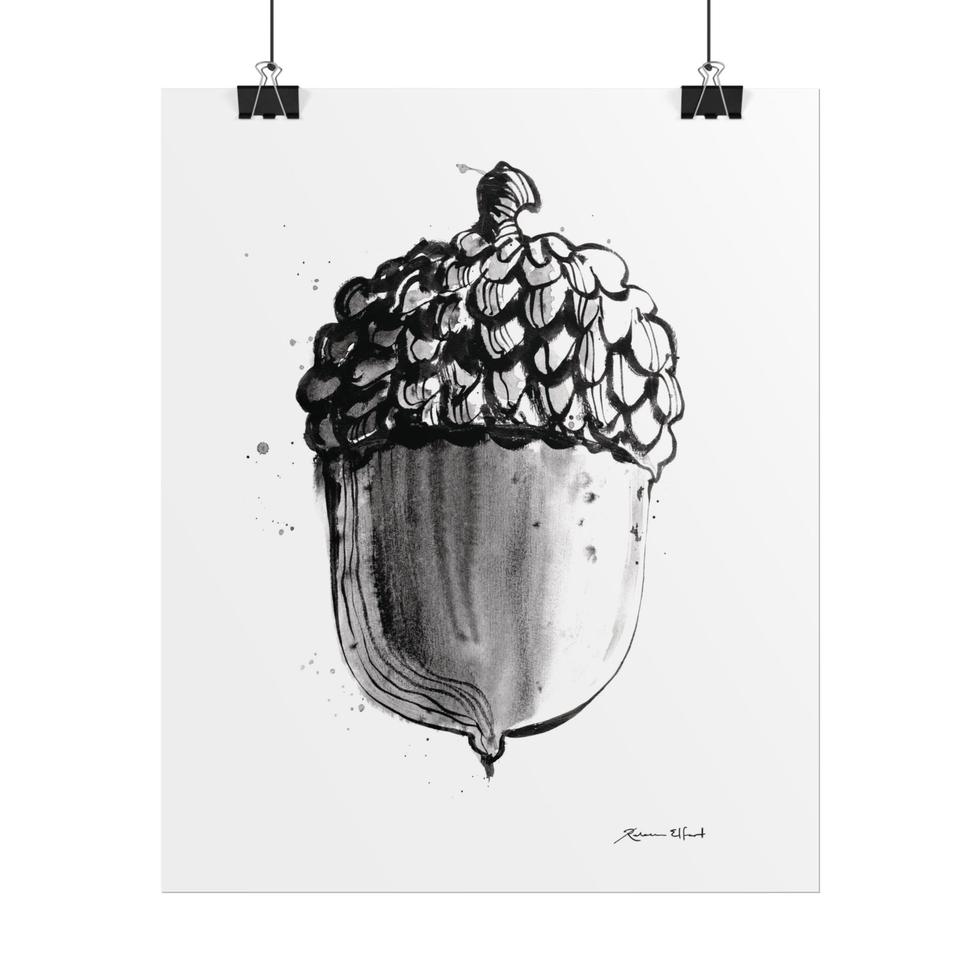 Bring a little bit of nature indoors with this elegant and artistic poster featuring a loose ink drawing of an acorn in black and white.