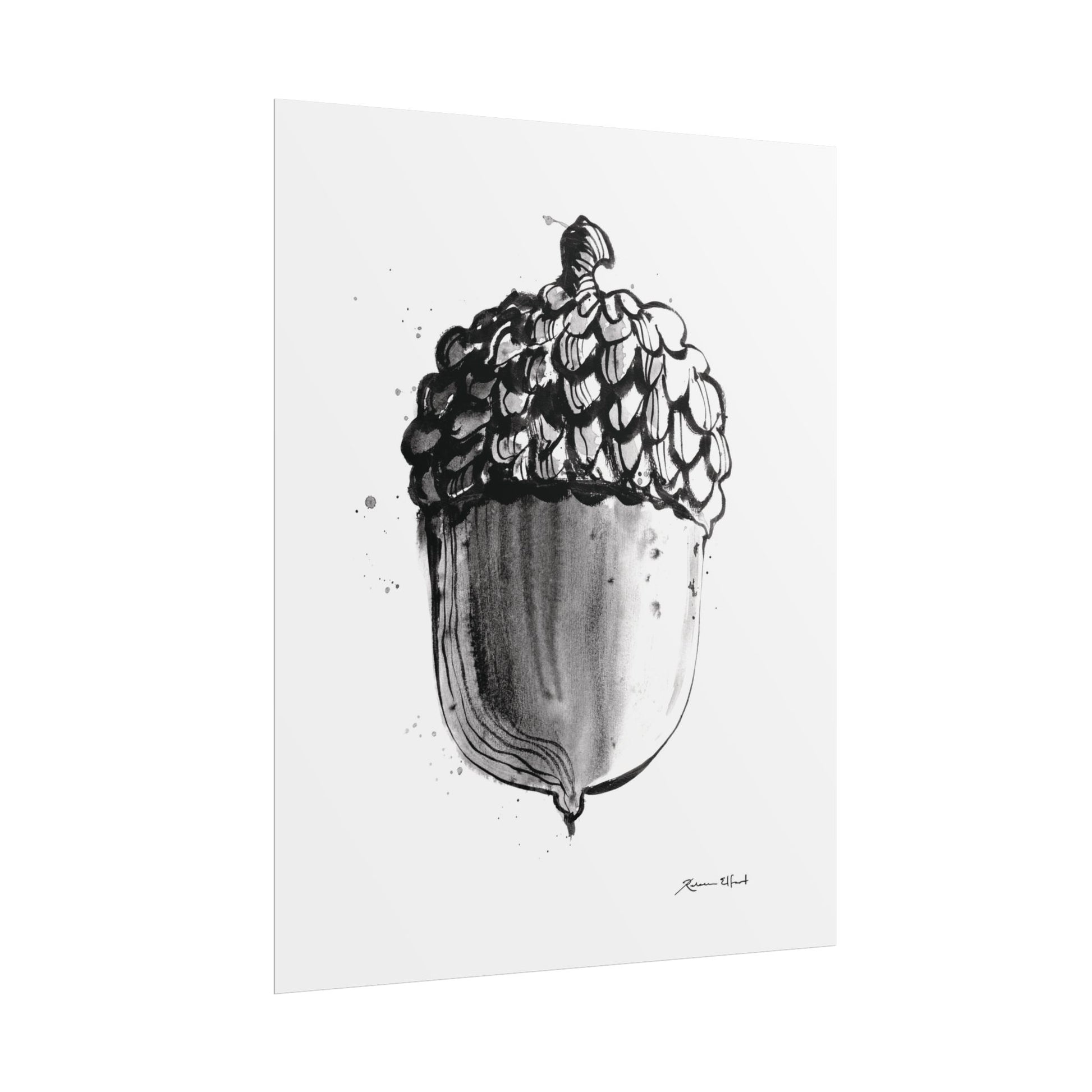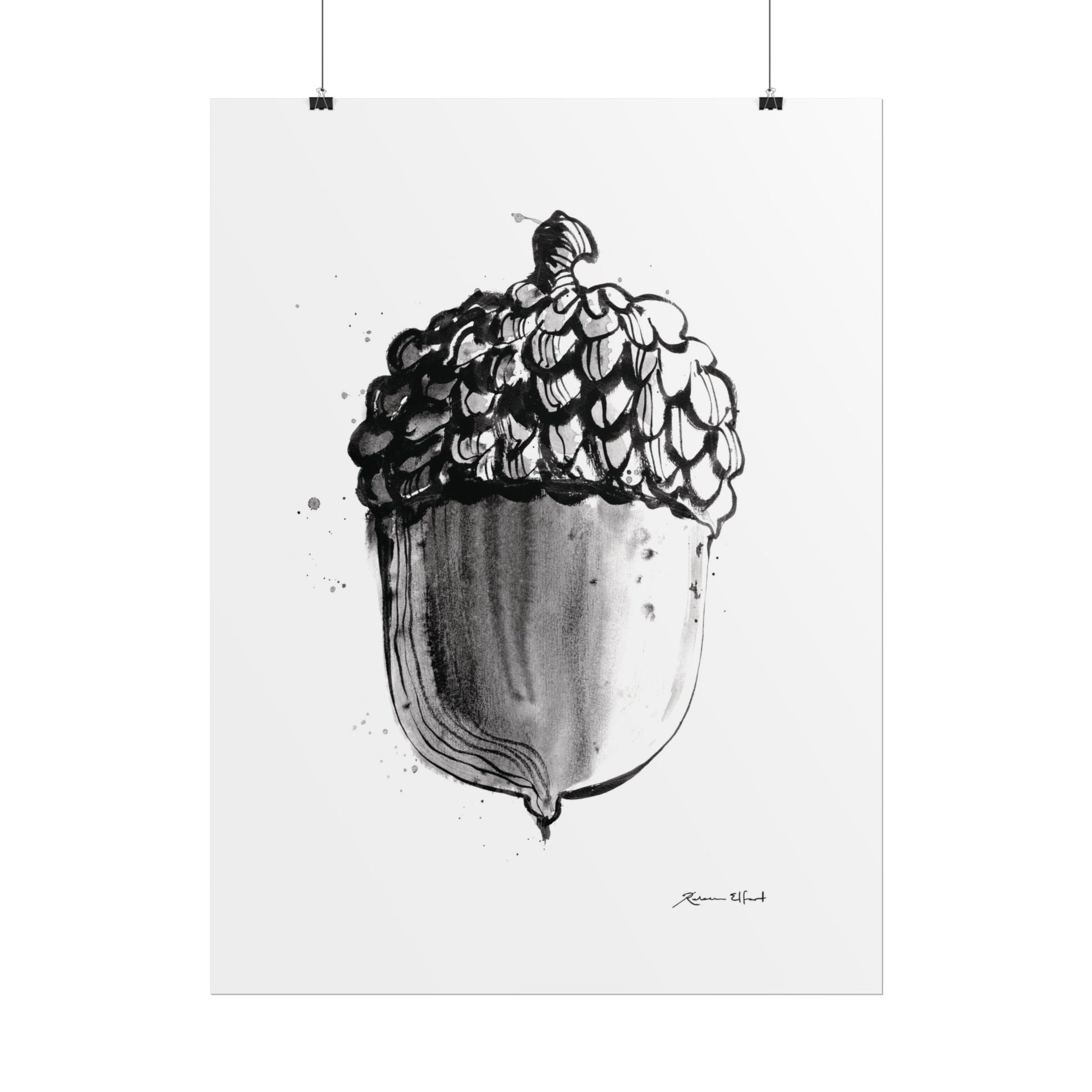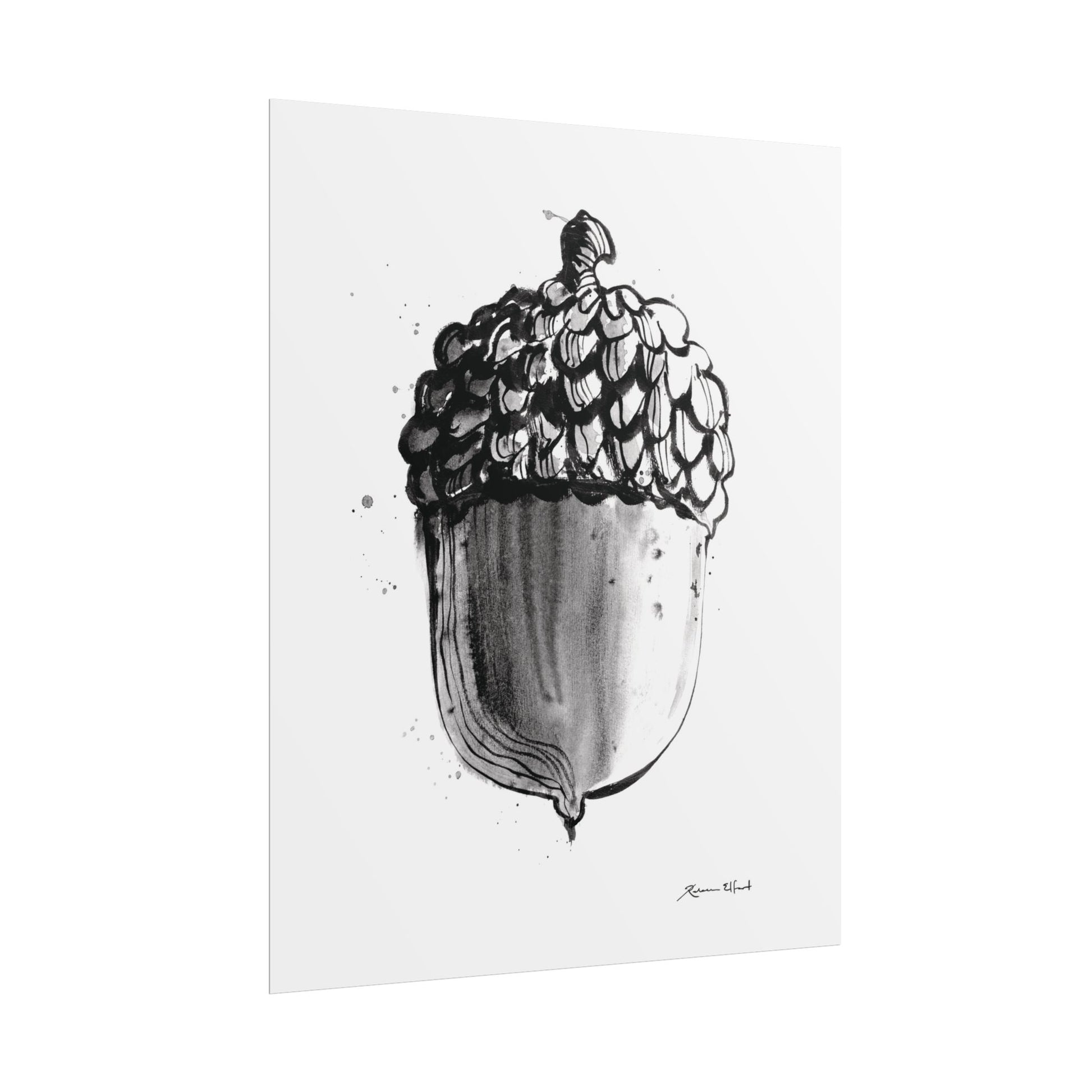 Bring a little bit of nature indoors with this elegant and artistic poster featuring a loose ink drawing of an acorn in black and white.
