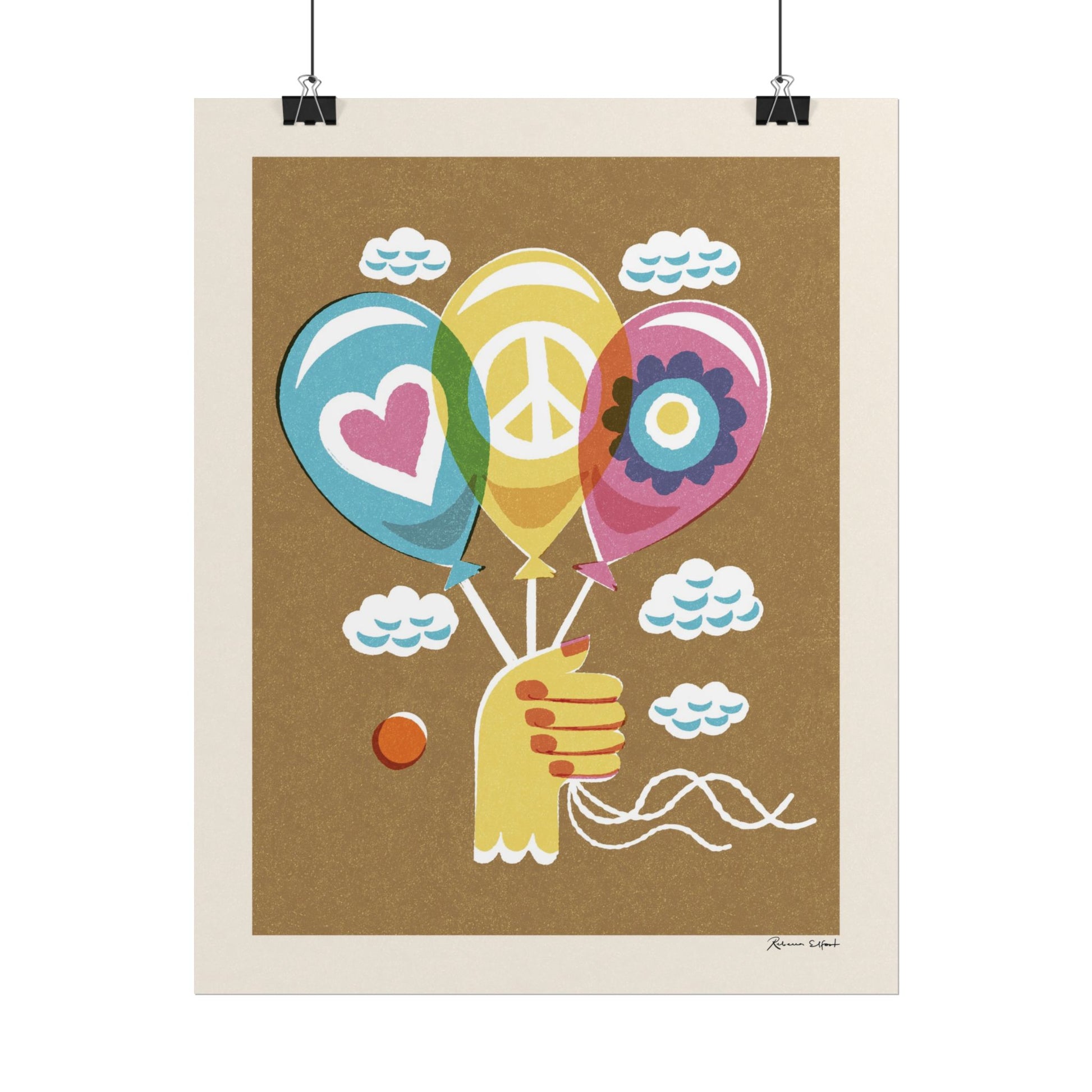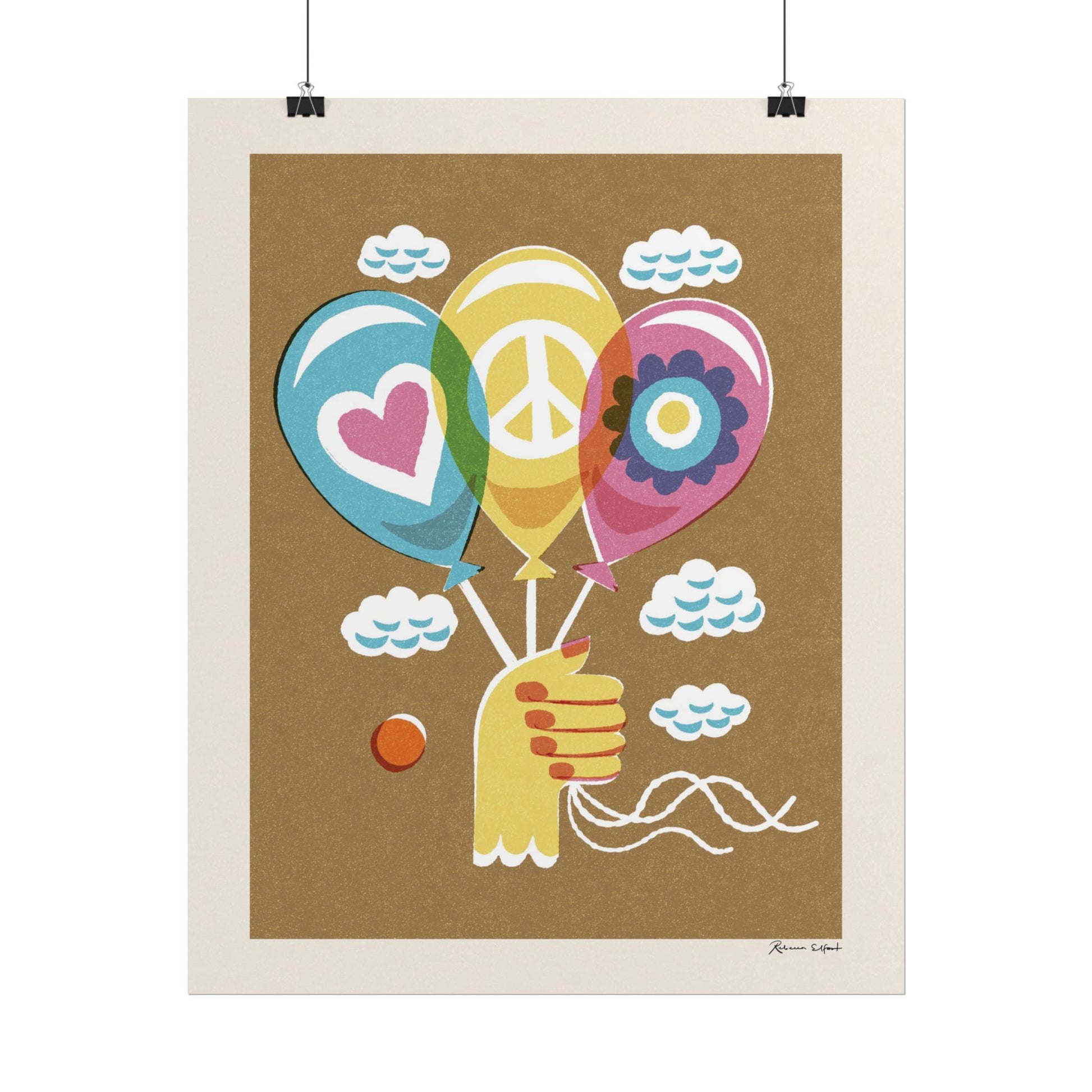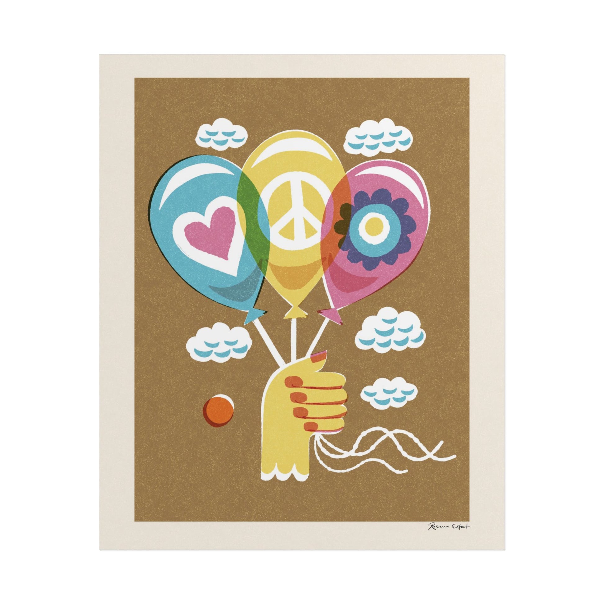 A colorful and textured vintage style poster featuring a layered illustration of a hand holding three balloons with peace and love symbols. Background is a deep brownish color. Perfect for a children's room, spreading a message of kindness, peace and playfulness. This poster is part of the Peace series and features a unique artwork by Rebecca Elfast.