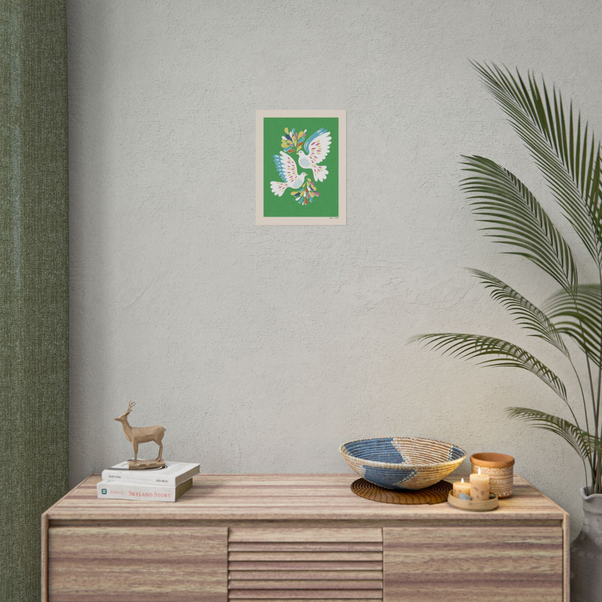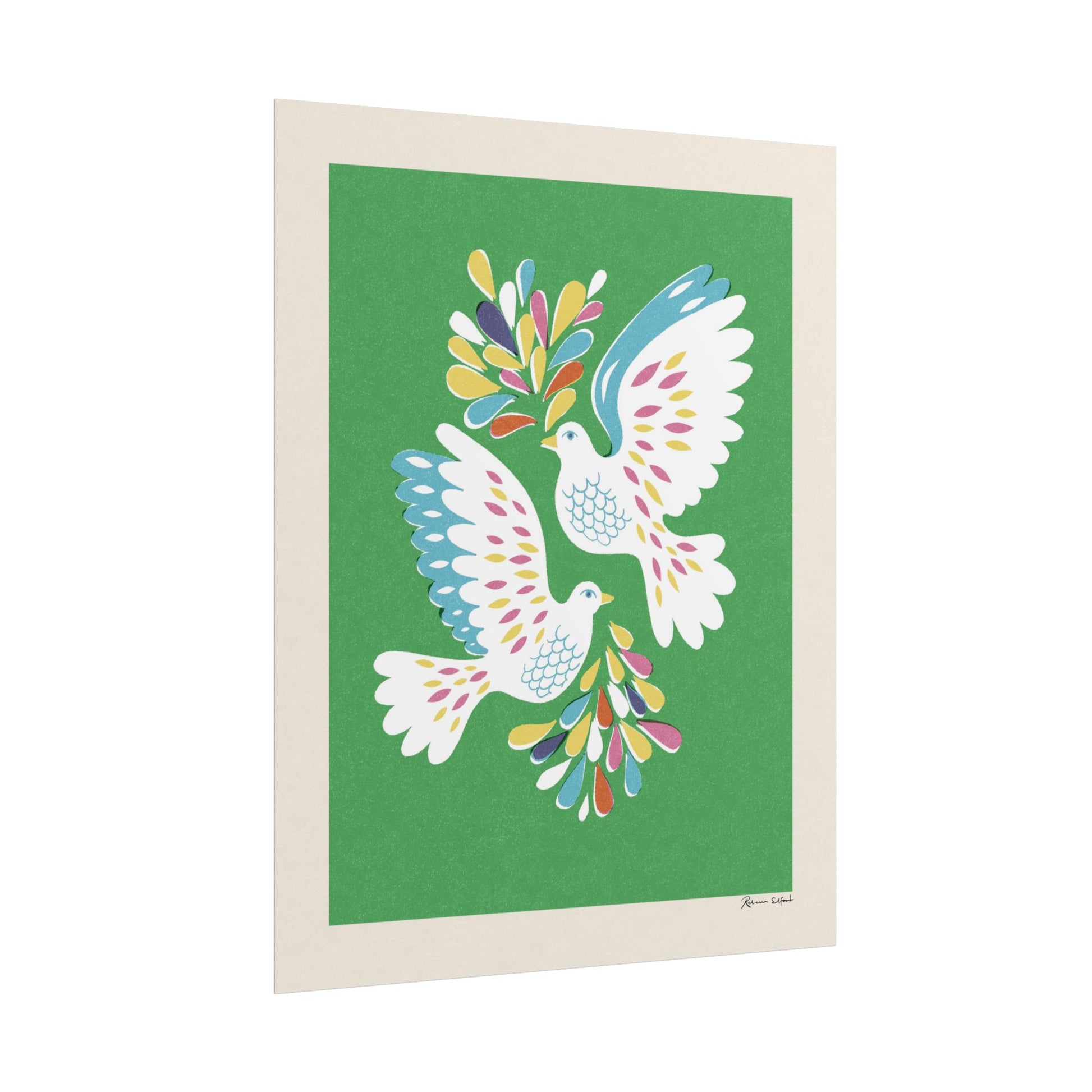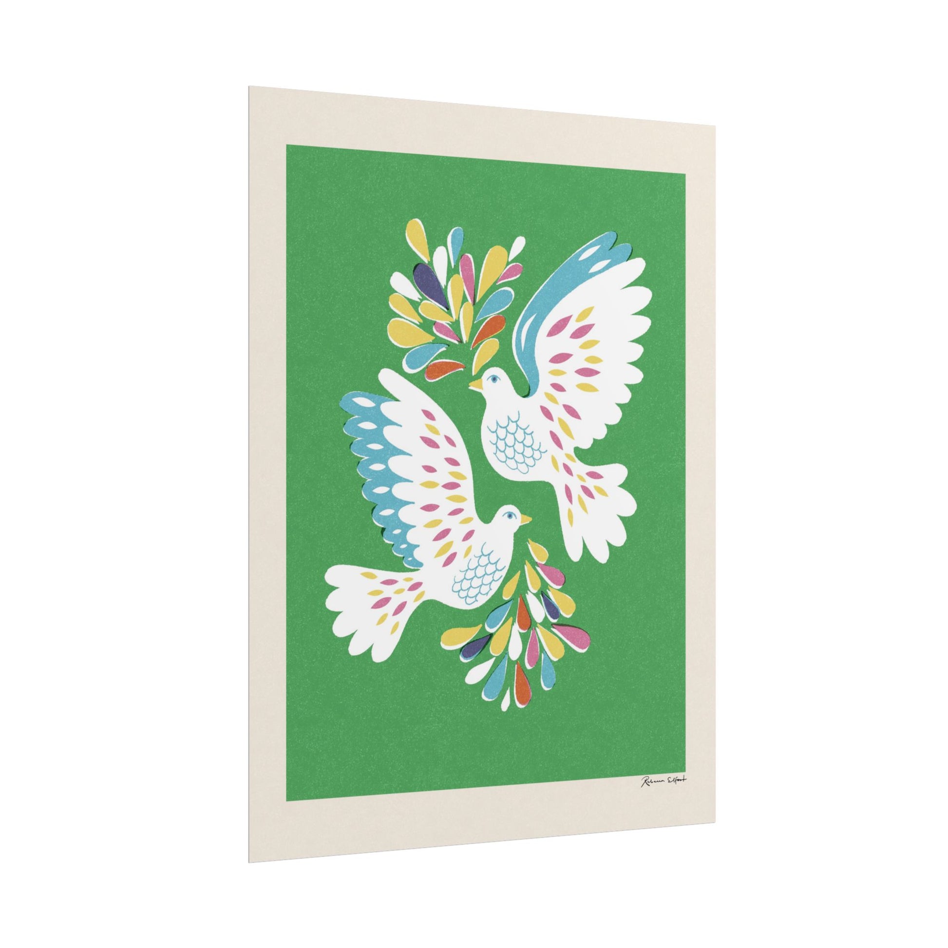 A colorful and textured vintage style poster featuring an illustration of two soaring love birds surrounded by colorful drops or leaves. Background is a deep green color. Perfect for a children's room, spreading a message of kindness, peace and playfulness. This poster is part of the Peace series and features a unique artwork by Rebecca Elfast.