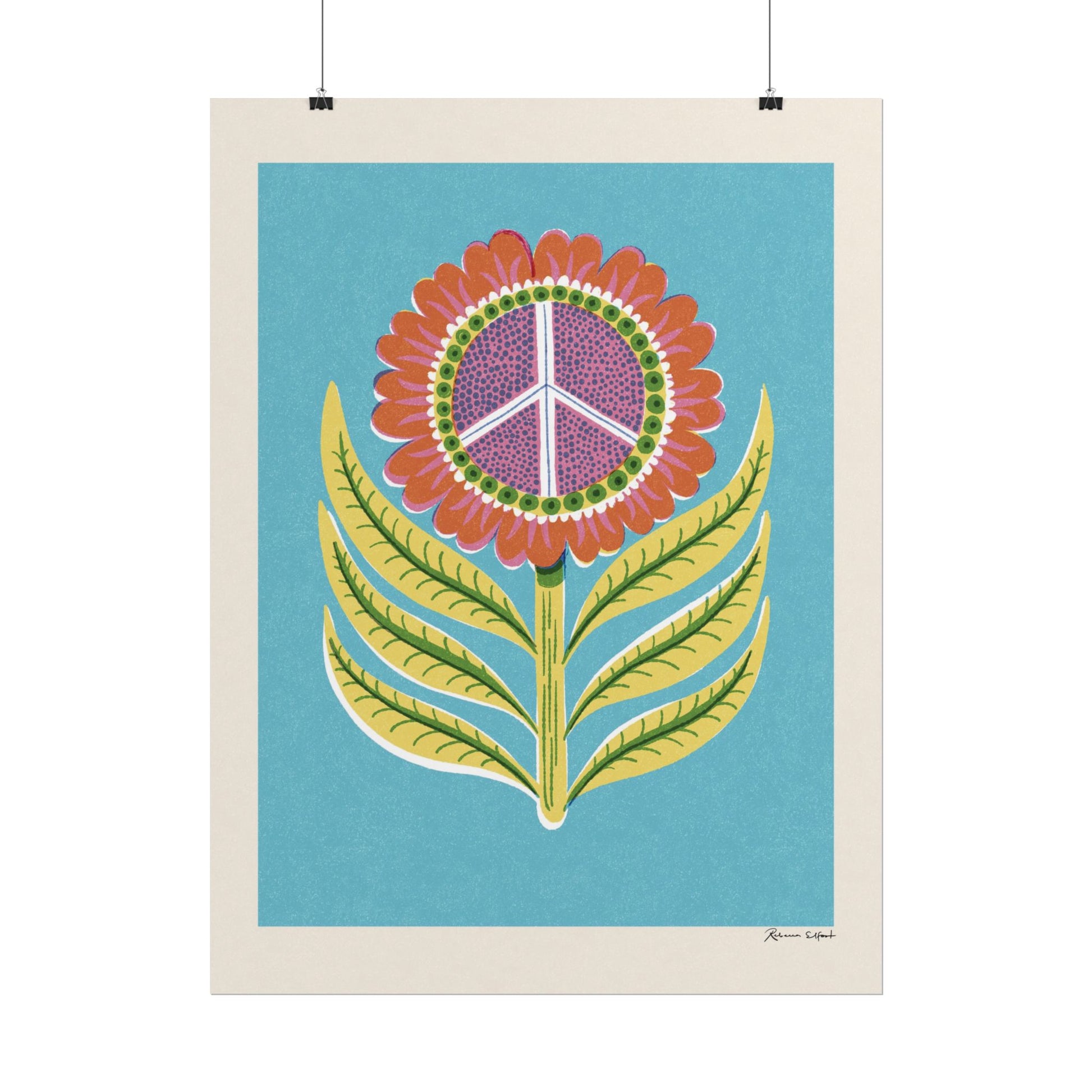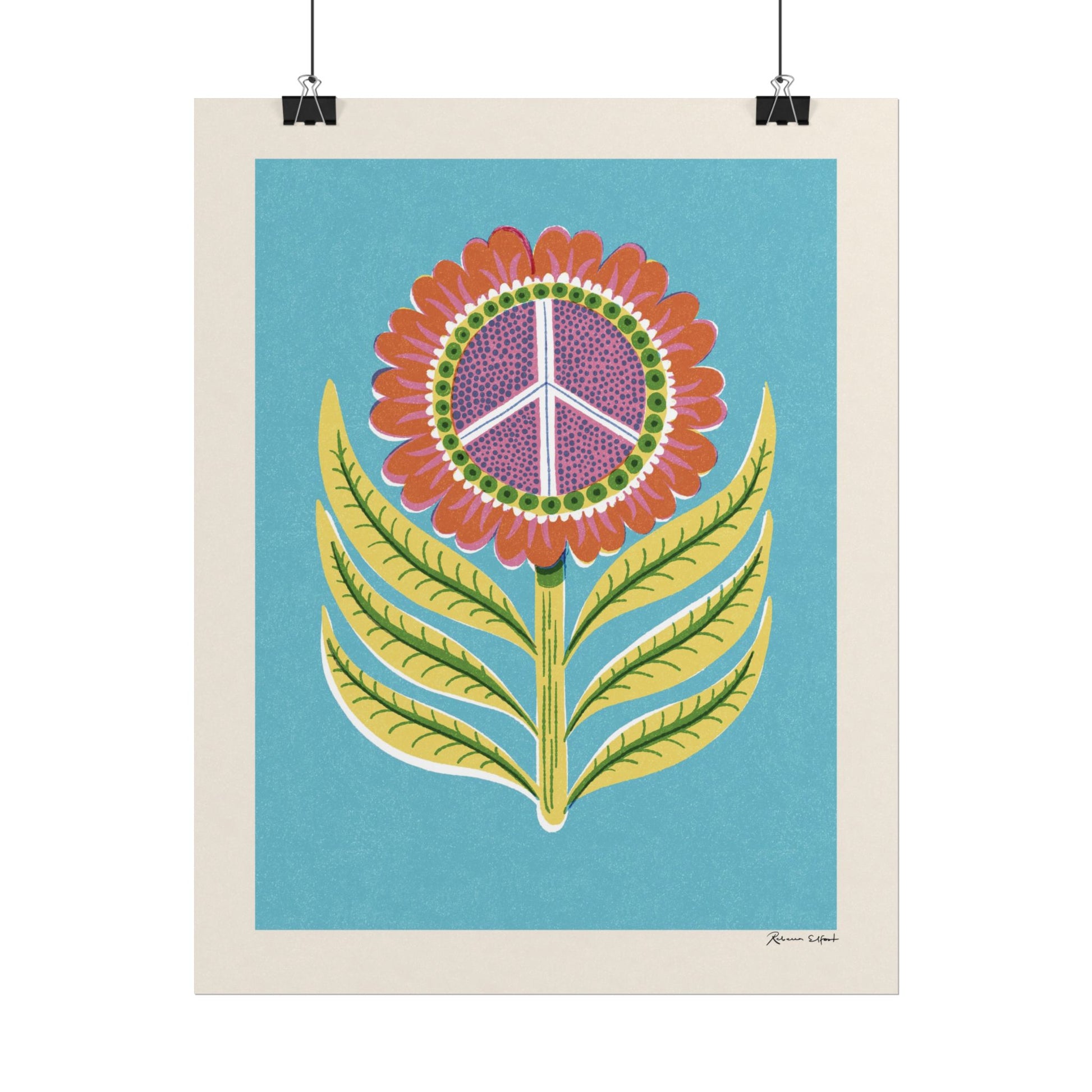 A colorful and textured vintage style poster featuring an illustration of a big sunflower, with a peace sign in the middle. Background is a cheery blue color. Perfect for a children's room, spreading a message of kindness, peace and playfulness. This poster is part of the Peace series and features a unique artwork by Rebecca Elfast.