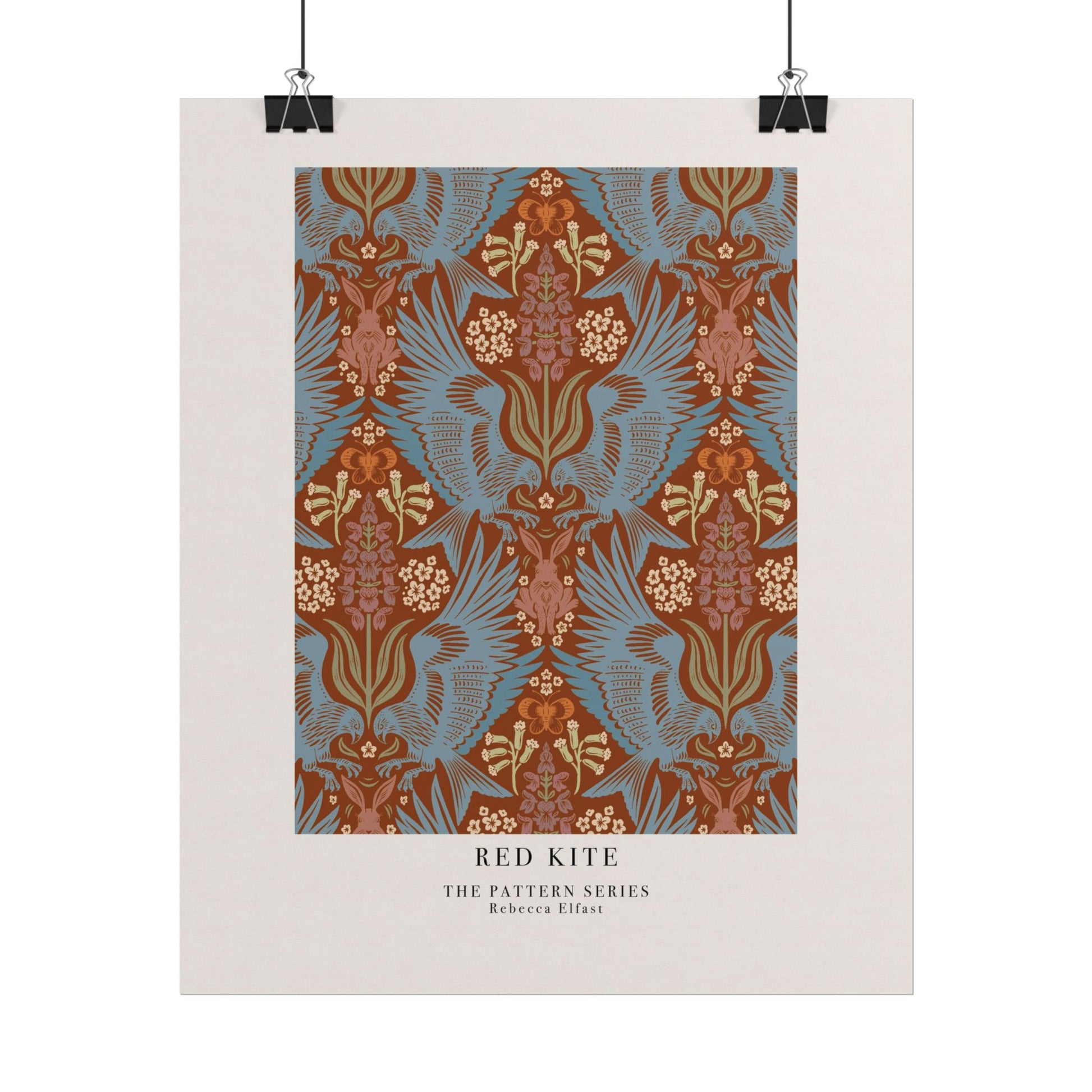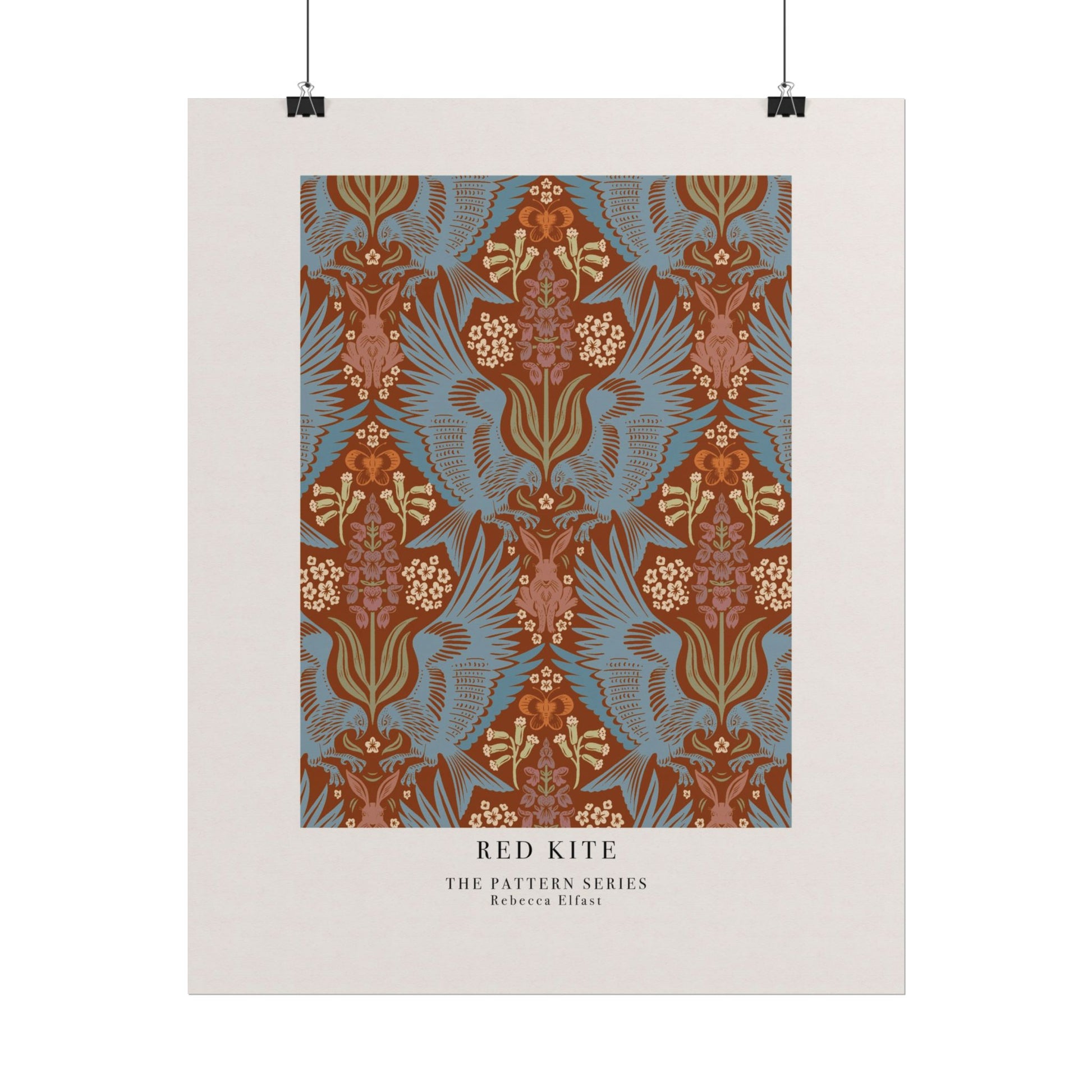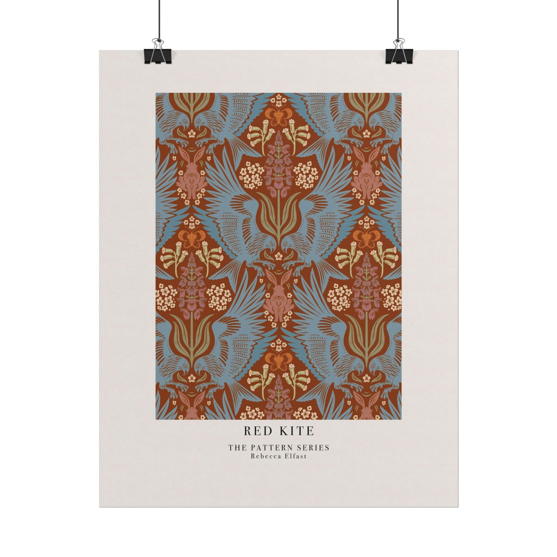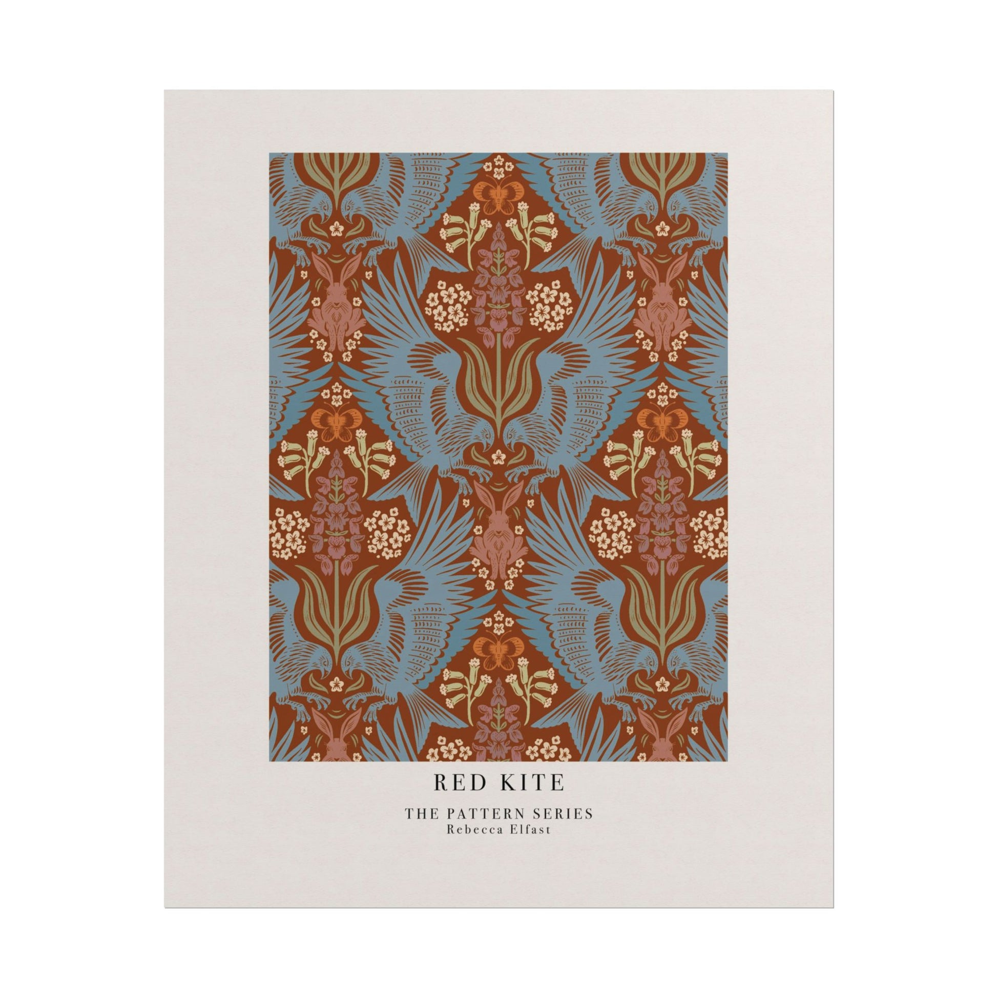 This art print brings Rebecca Elfast’s original artwork into your space, in the form of a beautiful pattern. This print features a symmetrical damask pattern with powerful red kites hunting hares among orchids. It is inspired by one of my many trips to Öland. It evokes a little bit of wanderlust and vintage flair. Unframed and ready to unroll, the print slips into a wide range of interiors: a calm corner for evening reading, a sunlit bathroom shelf, or a gallery wall mixed with travel finds.