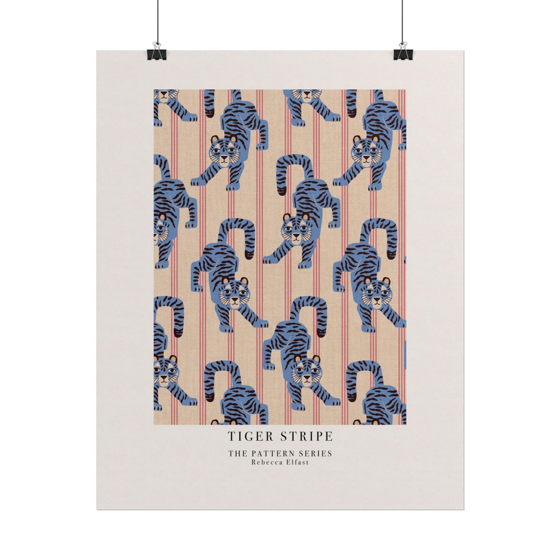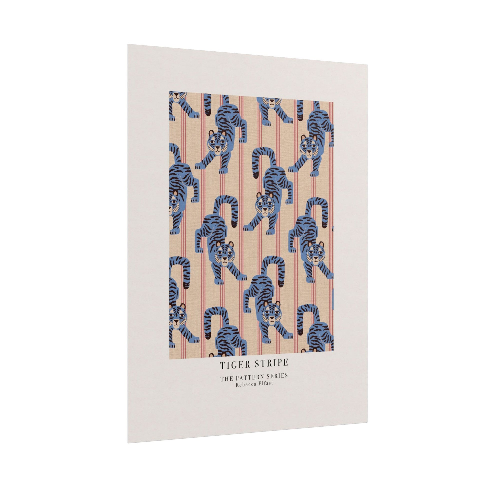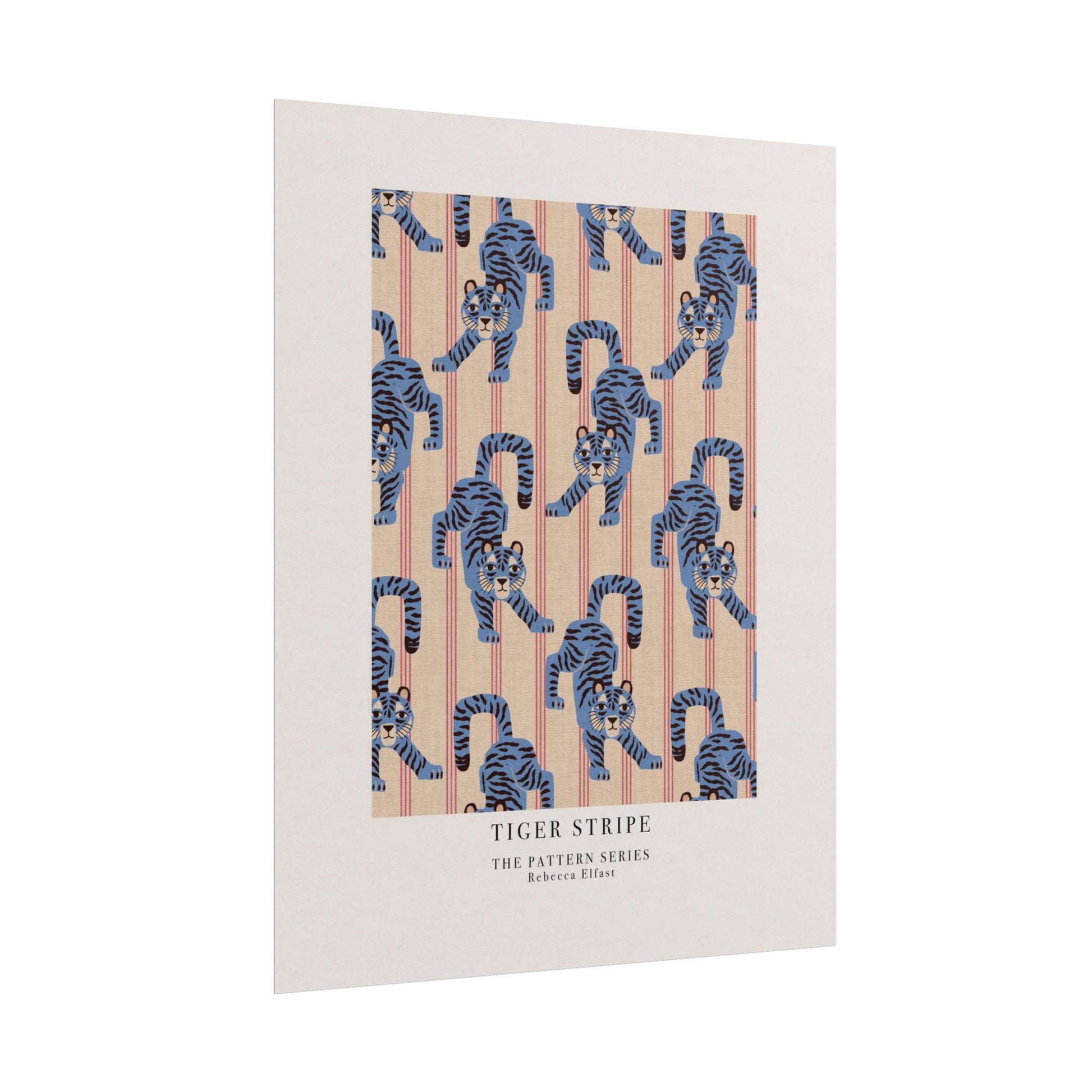 This art print brings Rebecca Elfast’s original artwork into your space, in the form of a beautiful pattern. This print features a serious looking tiger, sneaking around among some pink stripes. Unframed and ready to unroll, the print will bring a little wild spirit to your nursery wall.